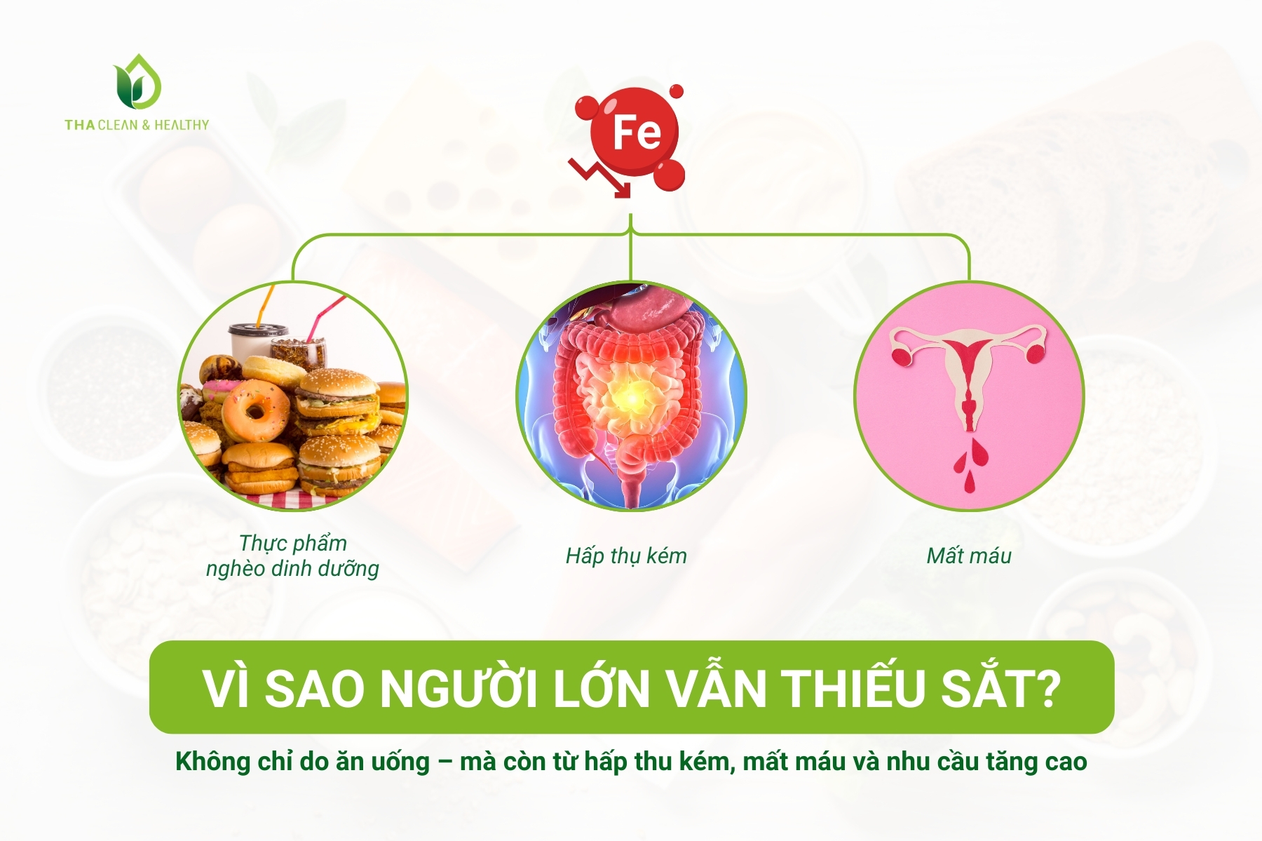 Theo Tổ chức Y tế Thế giới (WHO) và Viện Y tế Quốc gia Hoa Kỳ (NIH), thiếu sắt ở người lớn thường xuất phát từ nhiều nguyên nhân chứ không đơn thuần do ăn uống: