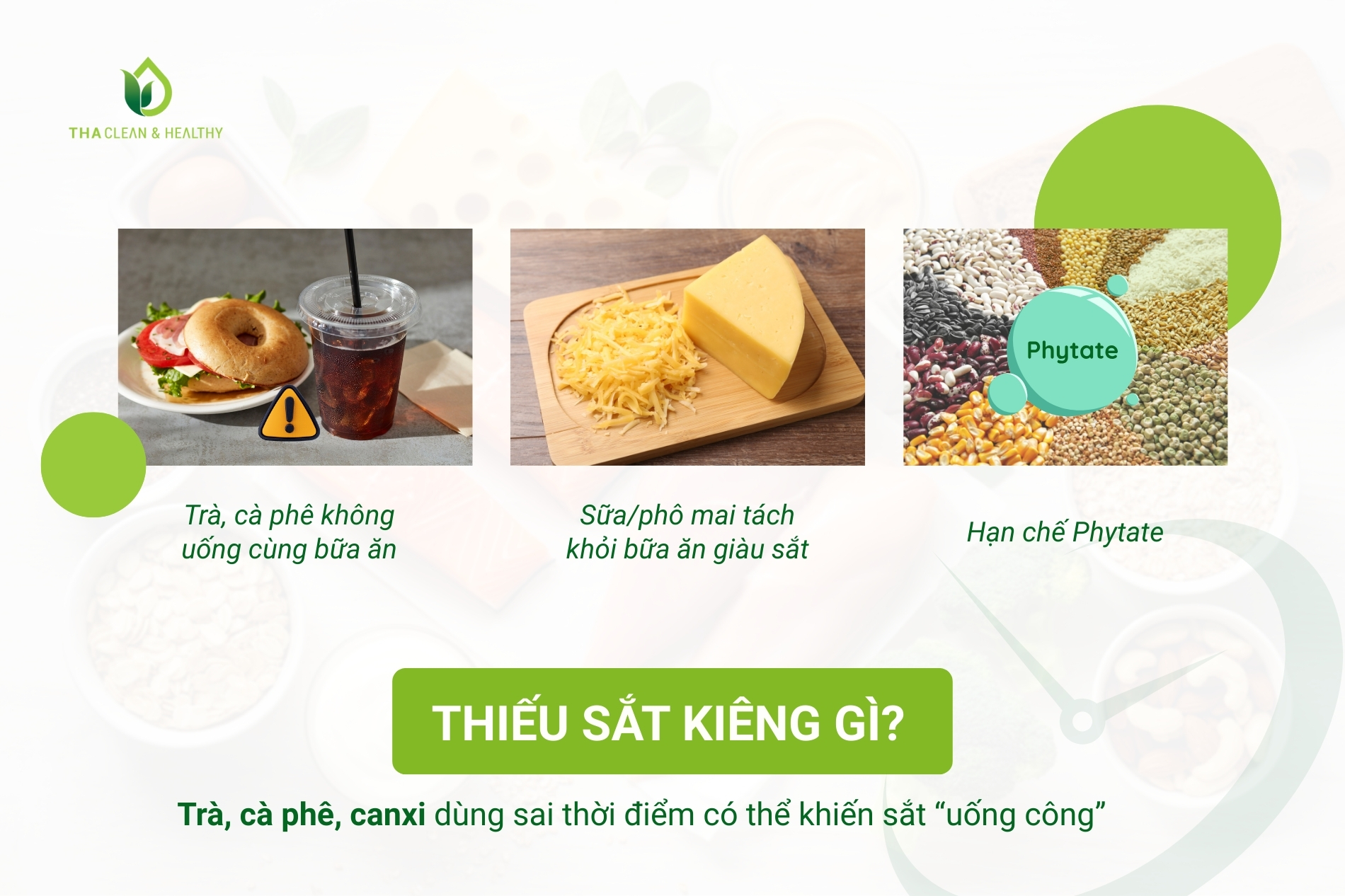 Tránh các chất cản trở hấp thu sắt tại cùng bữa ăn như canxi, polyphenol (trà, cà phê), phytate (cám nguyên hạt chưa xử lý) vì chúng có thể làm giảm hấp thu sắt đáng kể nếu dùng cùng lúc.